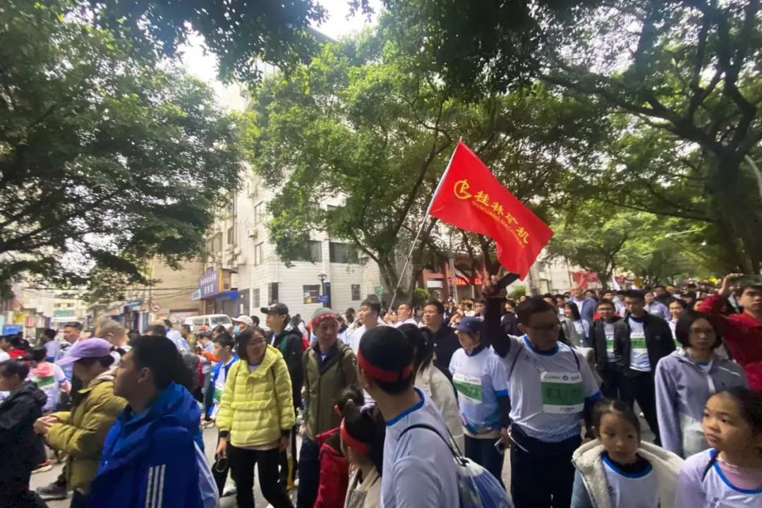3月26日上午8:00,2023年桂林馬拉松在桂林市中心廣場鳴槍開跑。來自全球11個國家和地區(qū)的3萬名選手,齊聚山水甲天下的煙雨桂林,在賽道上熱血奔跑。桂林礦機(jī)的跑團(tuán)成員們,高舉桂礦旗幟,縱情狂奔,成為賽道上一簇耀眼的光芒。