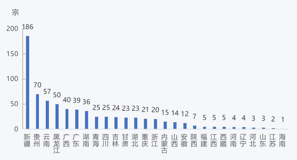 2022年,全國新設砂石礦權數量719宗,其中新疆新設砂石礦權數量最多,為186宗;貴州、云南、黑龍江新設砂石礦權數量為50~70宗;廣西、廣東、湖南新設砂石礦權數量為35~40宗;青海、四川、吉林、甘肅、湖北、重慶、浙江、內蒙古、山西、安徽新設砂石礦權數量為10~25宗;陜西、福建、江西、西藏、河南、遼寧、河北、山東、江蘇、海南新設砂石礦權數量在10宗以內。